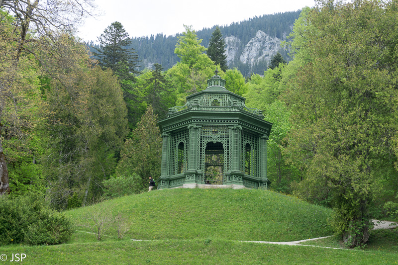 Priešingoje pusėje – apvali pavėsinė, padabinta ažūriniais kaltinės geležies raštais. Nuo čia vėlgi atsiveria puiki Linderhofo panorama.