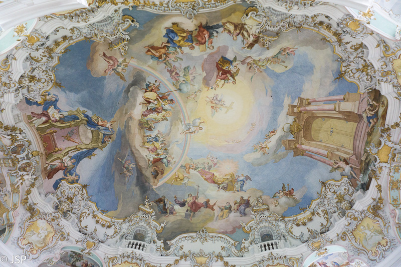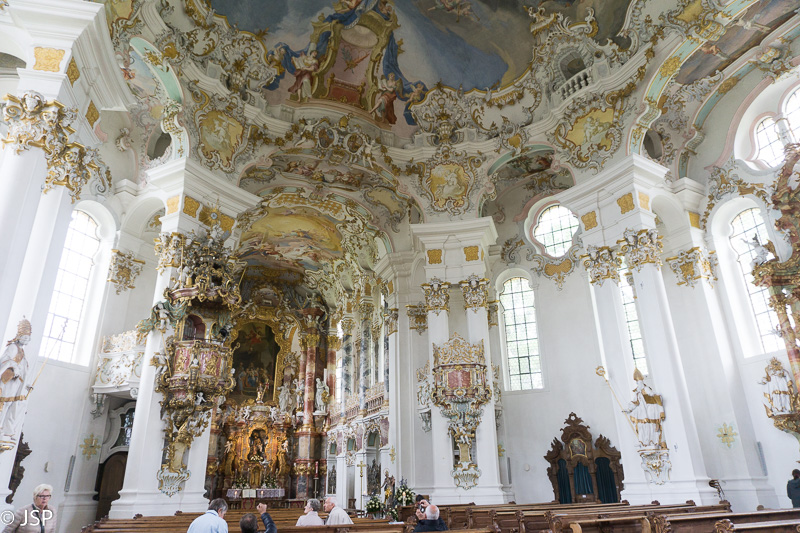 Nors oras nelepina – dar labiau apsiniaukia, porąkart net lietus trumpai nupurškia – Linderhofe labai smagiai praleidžiame beveik dvi valandas. Vėl grįžę prie įėjimo, važiuojame dar toliau į šiaurę ir gal po pusvalandžio pasiekiame Weiskirchen. Šios vietos įžymybė – labai gausiai ir įspūdingai išpuošta barokinio stiliaus bažnyčia, dėl savo nepaprasto puikumo vadinama „pono dievo pokylių sale“.
