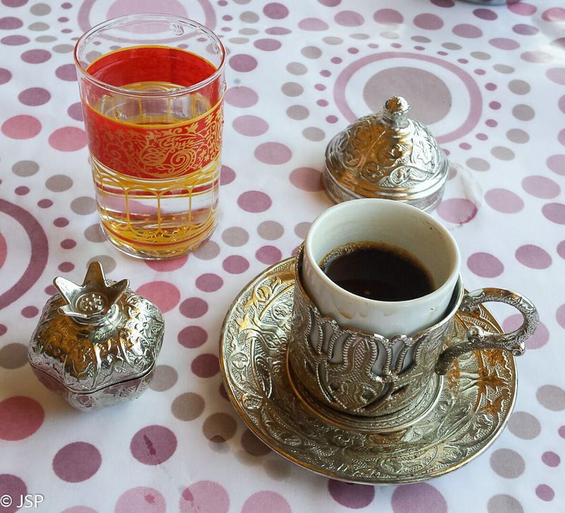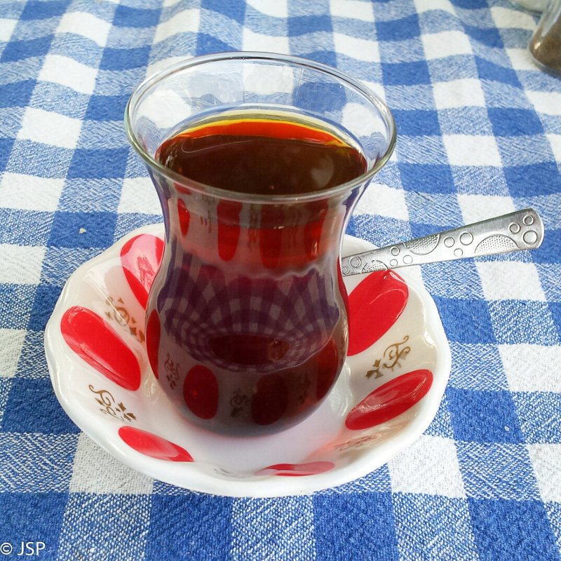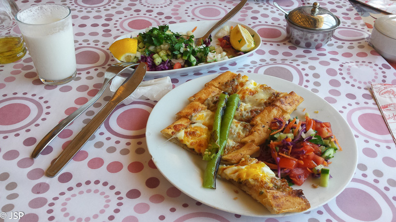 Grįždami prisėdame jaukioje pustuštėje kavinukėje netoli bažnyčios (dauguma turistų matyt taip aukštai neužlipa?), sutaršome po labai skanų gozleme blyną su sūrio įdaru ir užgeriame tradicine obuolių arbata.