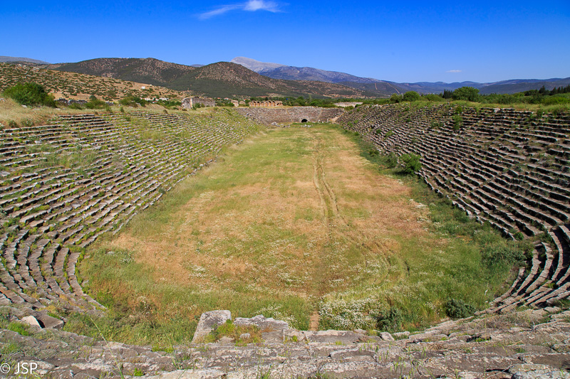 Didžiausią įspūdį palieka stadionas – gana gerai išsilaikęs ir išvengęs perdėtai kruopščios restauracijos. Ir tikrai didžiulis – sunku net nusakyti, koks didelis. Per aukštą žolę einame nuo vieno jo galo iki kito, aptrupėjusiais akmeniniais laiptais lipame aukštyn ir prisėdame ant saulės įkaitintų akmenų pačiame viršuje. Stadionas nuo čia – kaip ant delno!