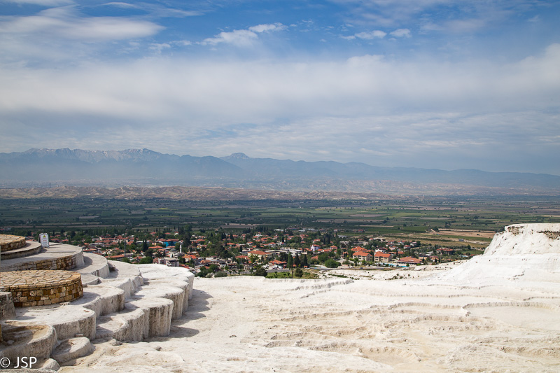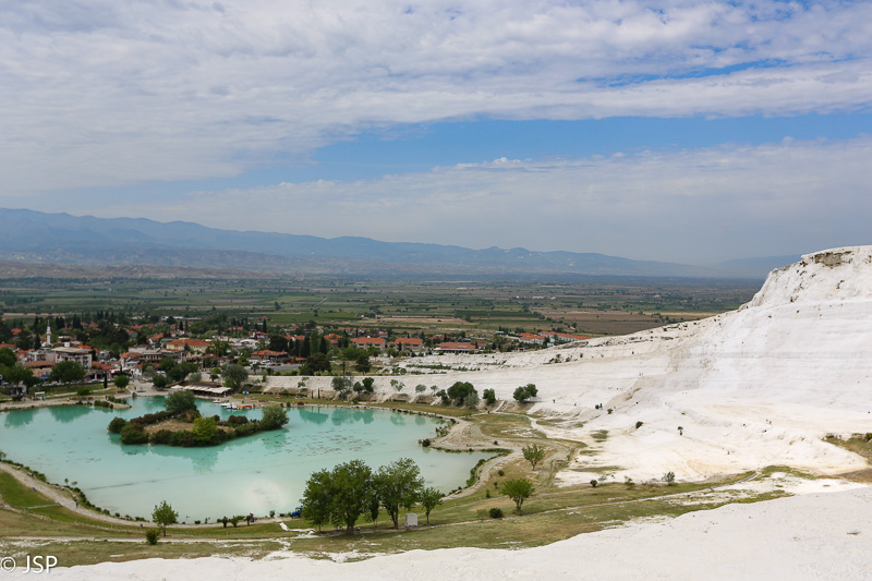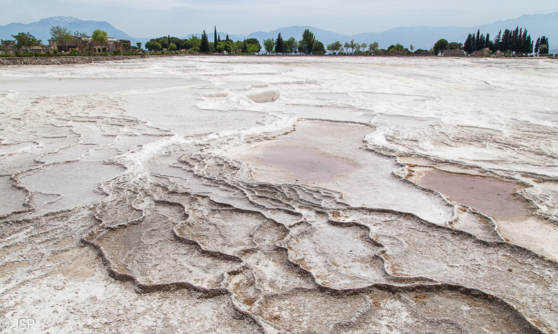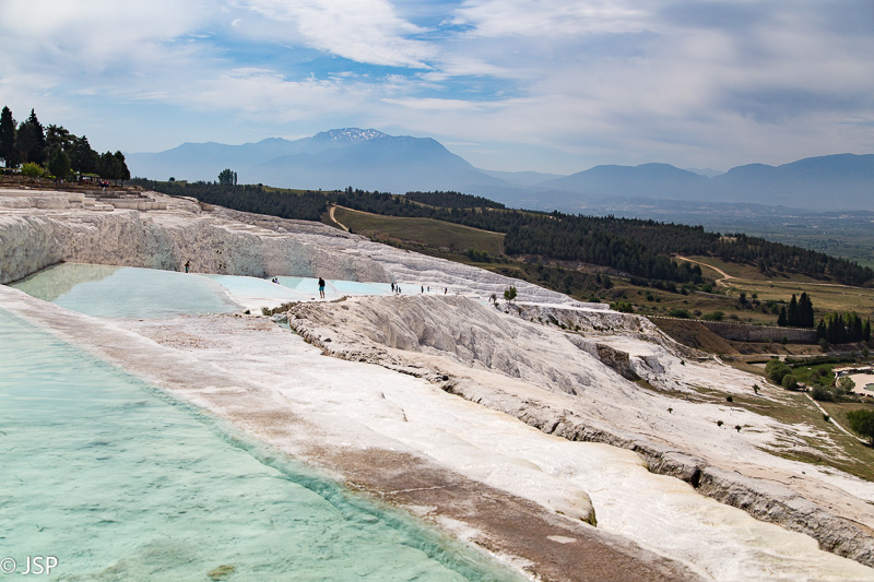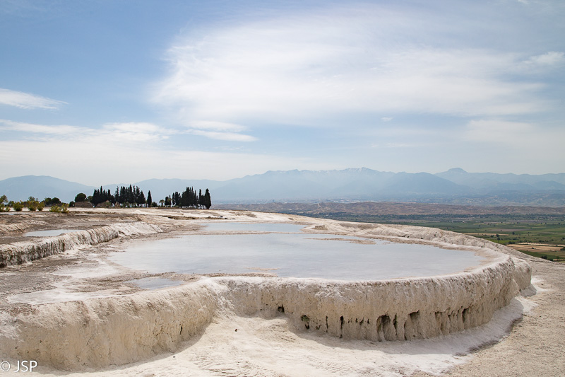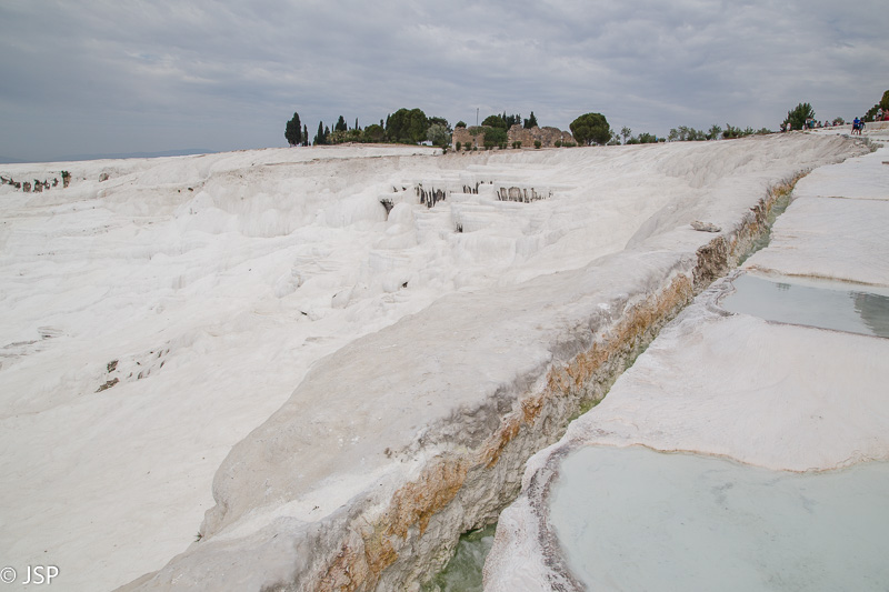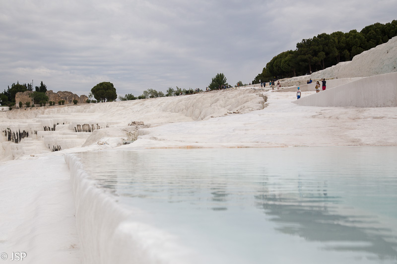 Griuvėsius paliekame vėlesniam laikui ir einame prie skardžio krašto, ten, kur baltuoja garsieji Pamukalės baseinėliai, pilni šilto vandens. Ar bent jau turėtų būti pilni vandens, kaip tose gražiosiose nuotraukose, seniai tapusiose šios vietos simboliu. Mūsų vizito metu dauguma baseinėlių tušti, tik vienoje pusėje palei skardį žemyn tęsiasi vandens užlietų travertinų kaskada.