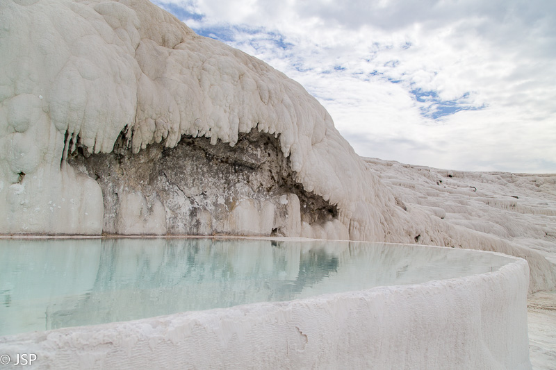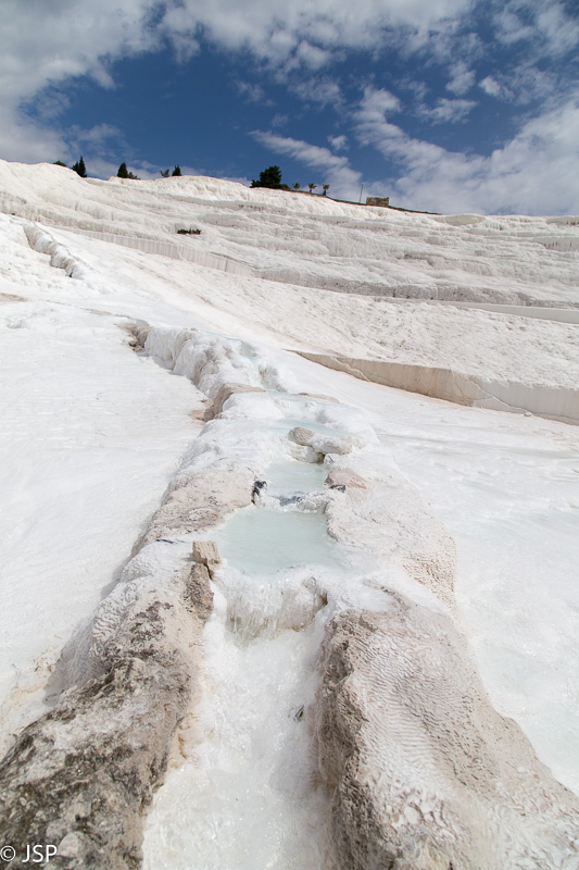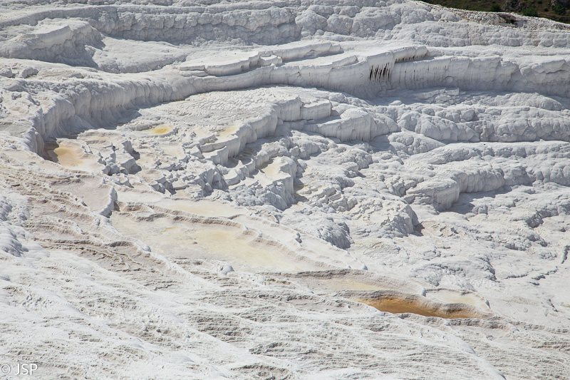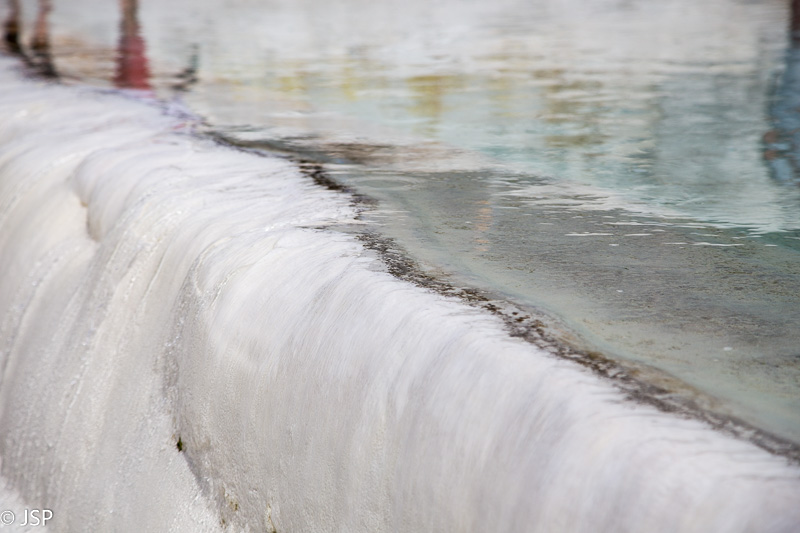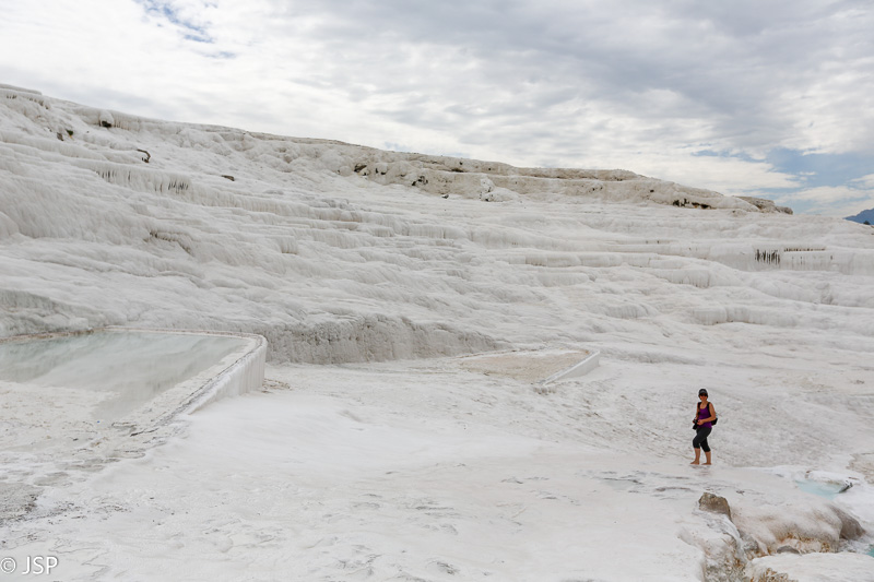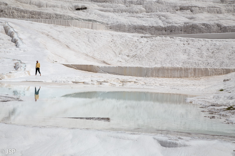 Nusiauname batus (po travertinas galima braidyti tik basomis) ir einame patyrinėti šio keisto balto pasaulio. Vanduo maloniai šiltas, o baltas travertinų paviršius stebėtinai neslidus – iš pradžių suabejojusi, vėliau jau drąsiai leidžiuosi gana stačiu šlaitu žemyn.