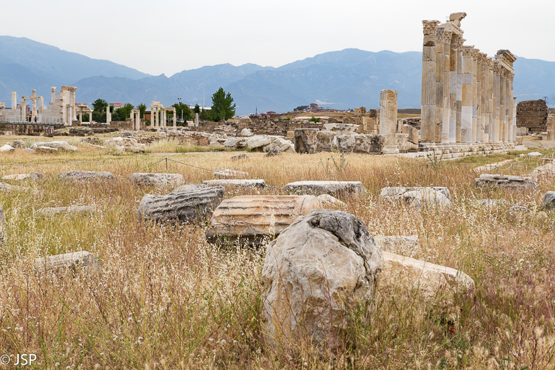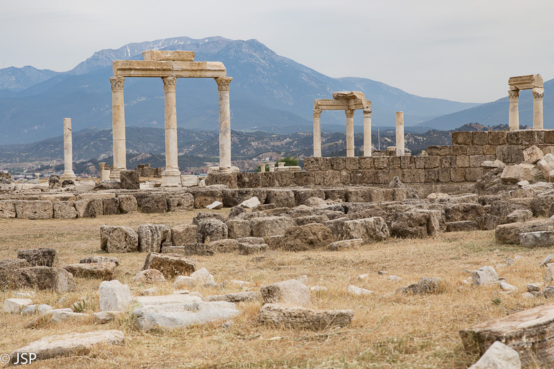 Dar tik trečia valanda, iki vakarienės daug laiko, taigi nusprendžiame pakeliui į viešbutį aplankyti dar vieną apleistą miestą – Laodikėją. Jis visai netoli ir kelią vėl randam labai lengvai, rudujų turistinių ženklų vedami. Laodikėjos griuvėsiai išsimėtę aukštos kalvos viršūnėje, aplink – erdvūs kalnų vaizdai. Didžioji griuvėsių dalis net nerestauruota (nors vyksta darbai) – čia dar stipresnis įspūdis, kad esi apleistoje, visų užmirštoje vietoje. Visai kita skalė ir kita atmosfera negu Hierapolyje, bet mums čia labai patinka.