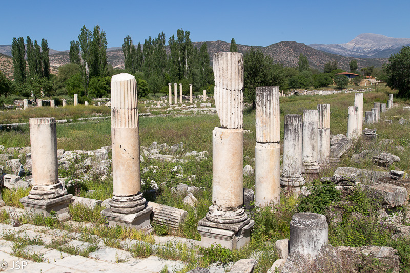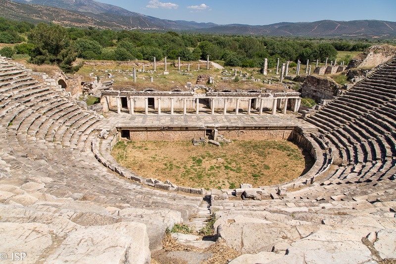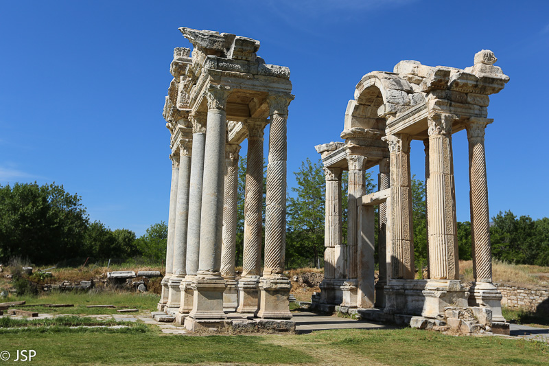 Pirmasis įspūdis deivės Afroditės garbei pastatytame mieste – jis labai nedidelis, per pusvalandį tikrai apeisime. Bet vos pakilus ant pirmojo kalniuko, kur yra amfiteatras, tampa aišku, kad užtruksime ilgiau nei planavome – popietės saulės užlieti miesto griuvėsiai driekiasi į visas puses, rodyklės žymi įvairius dėmesio vertus objektus, nežinia net, nuo ko pradėti. Aplink tvyro tyla ir ramybė, aukštoje žolėje dūzgia bitės, žmonių aplink beveik nėra. Vis turiu sau priminti, kad esame Turkijoje – labiau panašu į Graikiją, nors joje dar nesu buvusi. Nieko nuostabaus, žinoma – Aphrodisias klestėjimo laikais čia juk ir buvo Graikija.