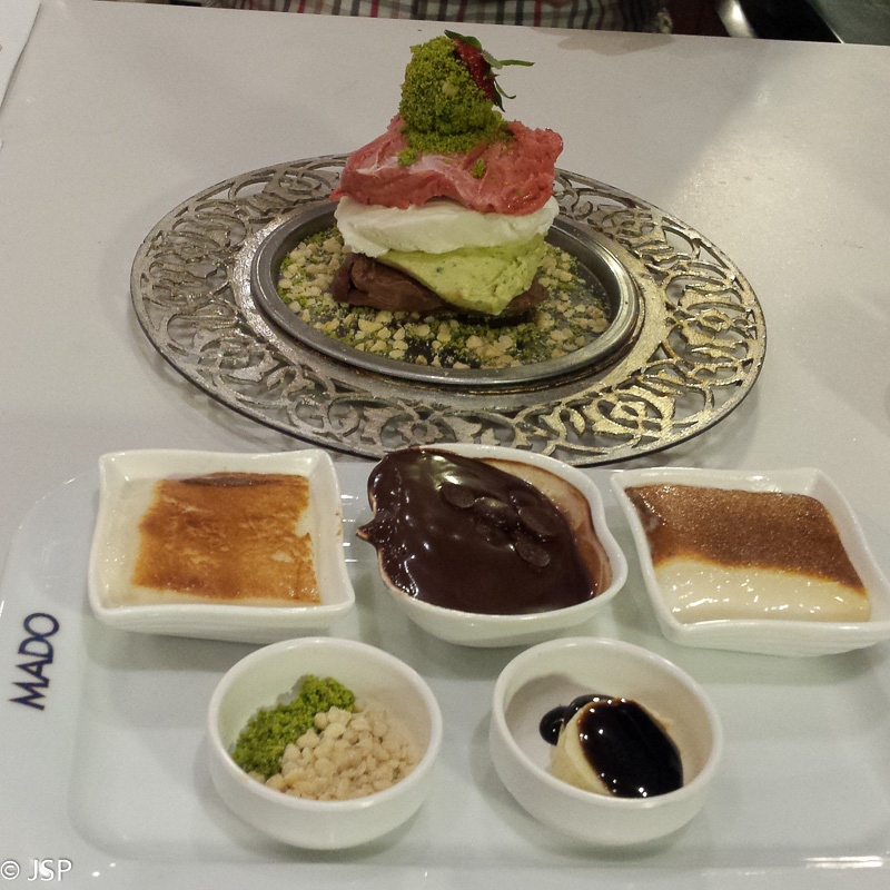 Vakare vėl bandome laimę viešbučio registratūroje – einame paklausti, kur galėtume pavalgyti. Šįkart mums pasiseka – paslaugus vaikinukas pasiūlo važiuoti į netoliese esantį Forum Camlik prekybcentrį, ten būsiąs platus pasirinkimas. Pasirinkimas tikrai platus, bet labiau parduotuvių (visos jos dar atdaros, nors jau aštuonios valandos), o kavinių nelabai gausu. Visgi randame vieną, kurios meniu yra ir vegetariškų patiekalų. Aš pasirenku meksikietišką patiekalą – fajitas su vištienos gabaliukais, o prie jo dar norėčiau kokių nors žalių salotų (meniu, žinoma, tik turkų kalba). Padavėjas sako pasitikėti juo, jis man parinksiąs tinkamiausias salotas. Gerai, pasitikiu – ir netrukus pasigailiu to pasitikėjimo, kai man atneša… Cezario salotas su vištiena! Na taip, logiška, jei fajitas su vištiena, tai ir salotos su vištiena, kad per mažai nepasirodytų! Na bet tiek to, nesiginčiju, juolab viskas skanu, nors ir per daug. Vakarą pabaigiame kavinukėje vienu aukštu žemiau, su turkiška arbata ir gimtadieniniu šokoladiniu pyragaičiu. Jis labai labai labai skanus! O kadangi gimtadienis, tai išbandau dar ir kazandizi – tradicinį turkišką desertą, skoniu primenantį keptą manų košę. Neblogas, bet į favoritų sąrašą nepateks.